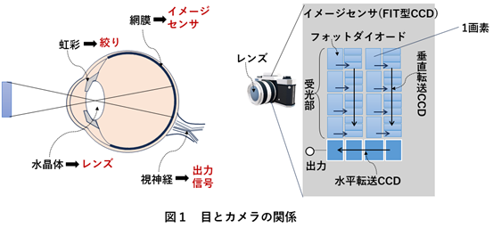目で物を見るときは、水晶体で焦点を合わせ、網膜で光を一旦写しだし、すぐに脳神経に転送します。(図1左)