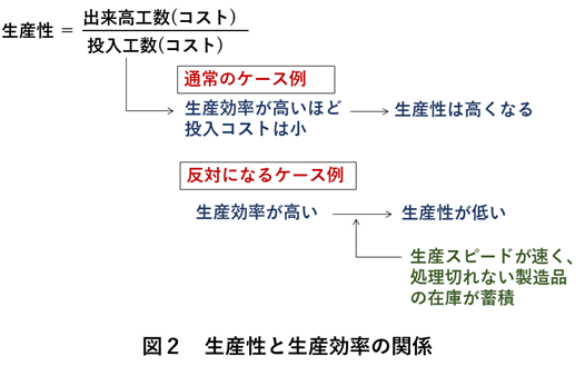 通常、生産性を決める投入工数は、生産効率が上がるほど少なくなるため、生産性は上がります。