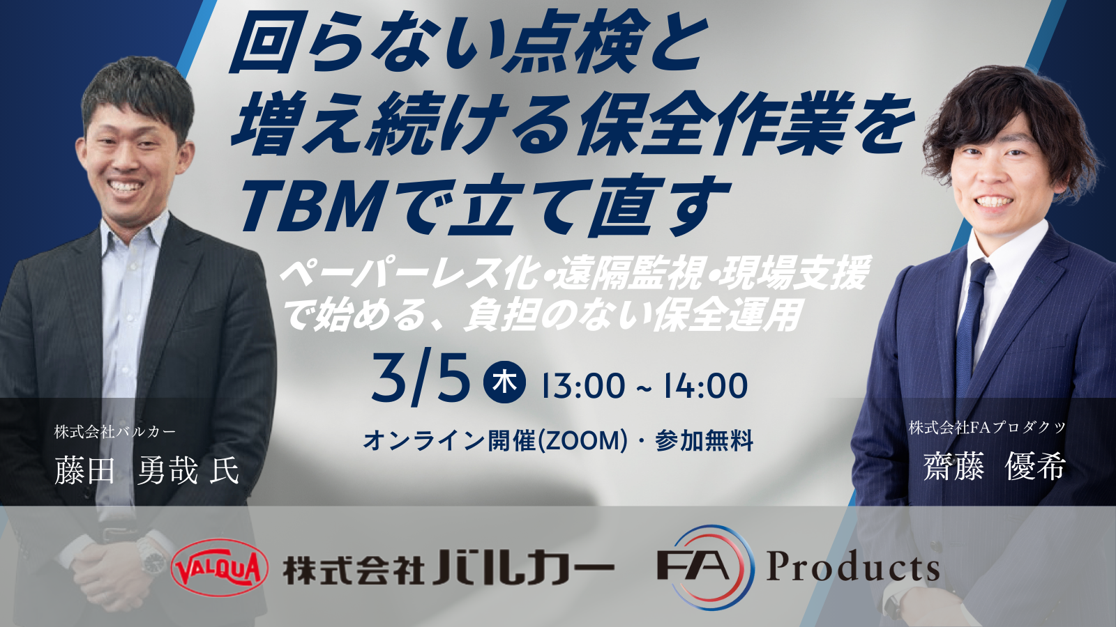 | 詳細・お申込み | お申し込みはこちら ※Googleフォームを利用できない方は omsales@fa-products.jp へ、下記の内容を記載いただき送信してください。 ・件名:「回らない点検と増え続ける保全作業を、TBMで立て直す」セミナー申込 ・氏名 ・フリガナ ・会社名、団体名 ・部署名 ・役職 ・電話番号 ・ウェビナーの情報をどこで知りましたか? |
